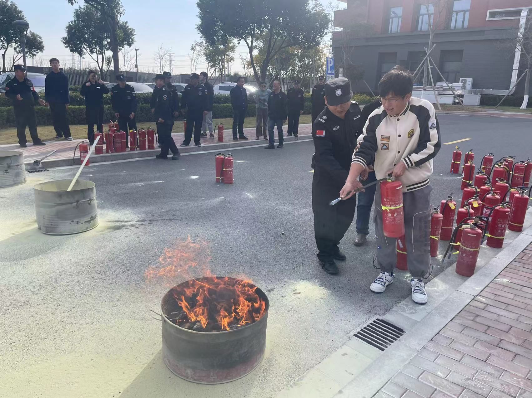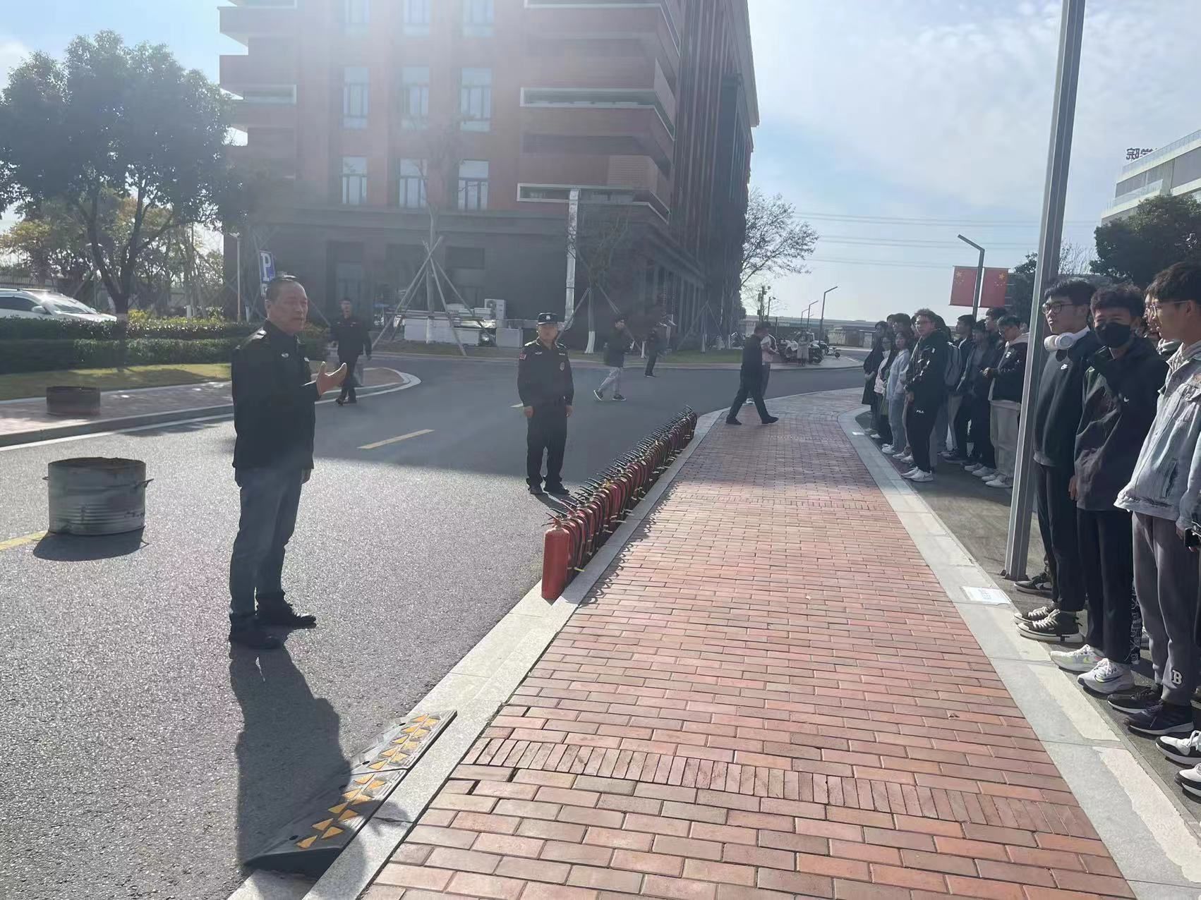 随后,在行政楼前,校区安保队长闫泽龙为大家做了消防安全知识普及,演示了灭火器的操作步骤,包括拔掉保险销、对准火源、均匀喷射等关键动作。通过近距离、沉浸式的互动学习,在场师生们对消防器材的使用方法和使用技巧有了更加深刻的认识。