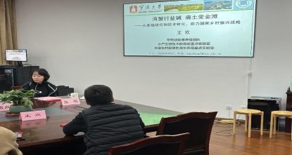 王欢副教授作为青蟹成功落地榆林市养殖的技术指导和服务对接代表,为考察团一行介绍了有关青蟹养殖的相关情况,尤其是青蟹养殖的技术探索和积累、养殖产生的经济效益、社会效益和环境效益等,引起了考察团成员的深厚兴趣。