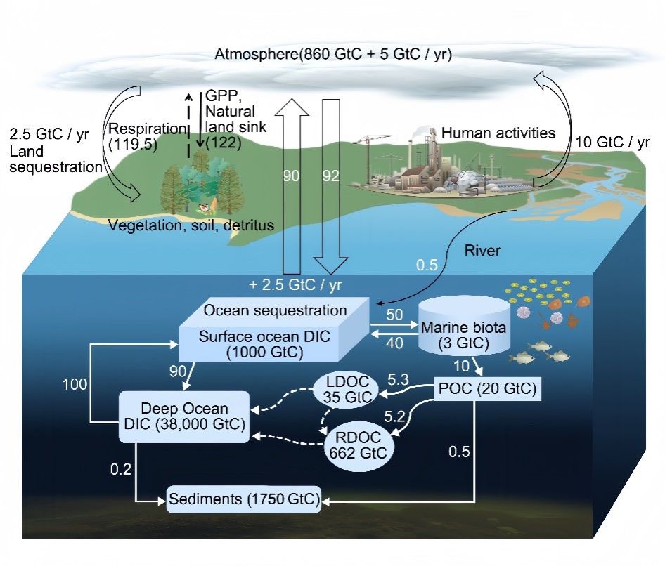 图2. 全球碳元素循环的示意图及浮游植物在全球碳循环中的作用(碳通量单位:Gt C/年;POC:溶解有机碳;LDOC:活性溶解有机碳;RDOC:惰性溶解有机碳;DIC:溶解无机碳)。