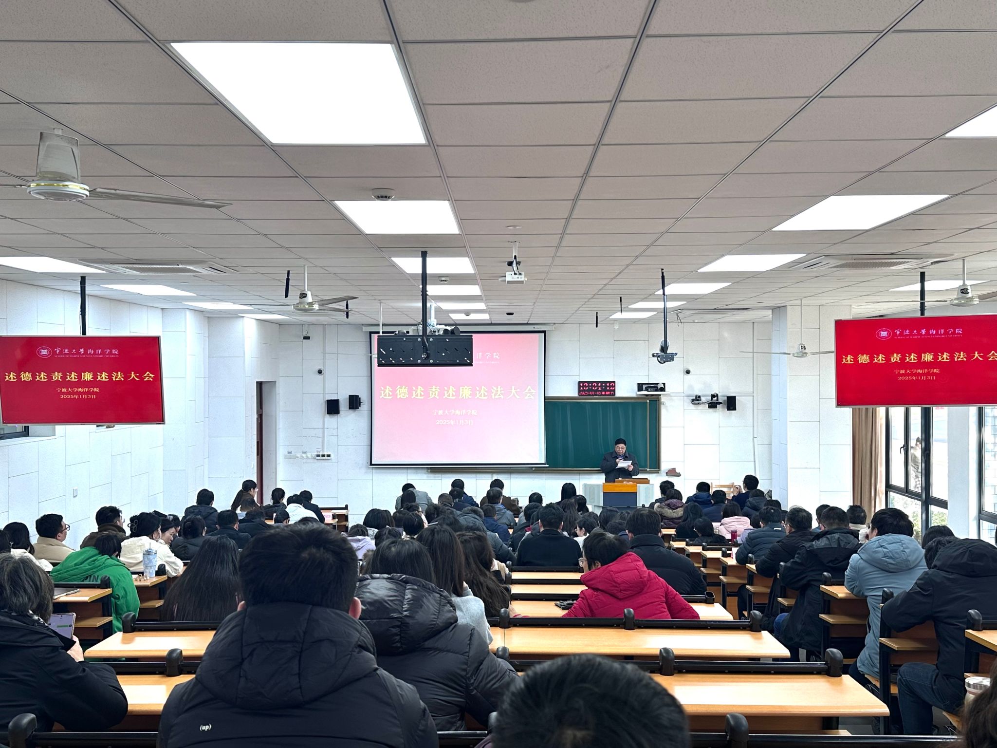 特聘院长王春琳、院党委书记邵丽先后作述德述责述廉述法报告,代表班子和个人从“德、能、勤、绩、廉”等方面作总结汇报。特聘院长王春琳结合学科建设、人才培养、科学研究、师资队伍、国际合作、社会服务等方面工作成绩进行总结汇报,通报截至2024年学院已完成第八轮聘期约60%的目标任务。党委书记邵丽结合基层党建工作、宣传思想文化工作、党风廉政建设工作等方面工作成绩进行总结汇报,分析了现存不足,交流了未来工作展望。