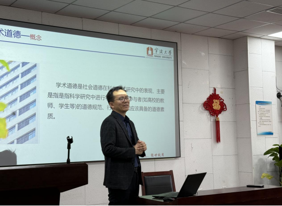 姜海波教授深入解读了学术道德的重要性、学术规范的具体要求以及学术不端的危害性,他结合国内外典型案例,系统剖析了学术造假、剽窃、数据篡改等行为的危害,详细讲解了学术引用的规范、成果署名原则以及实验数据的真实性要求。他特别指出,学术道德不仅是规则约束,更是学者自律精神的体现,“要让科研领域成为阳光下最纯洁,最神圣的一方净土”。他呼吁学生们要大力弘扬科学精神,恪守学术道德,以严谨的科研态度和强烈的社会责任感着力推进学术道德建设。