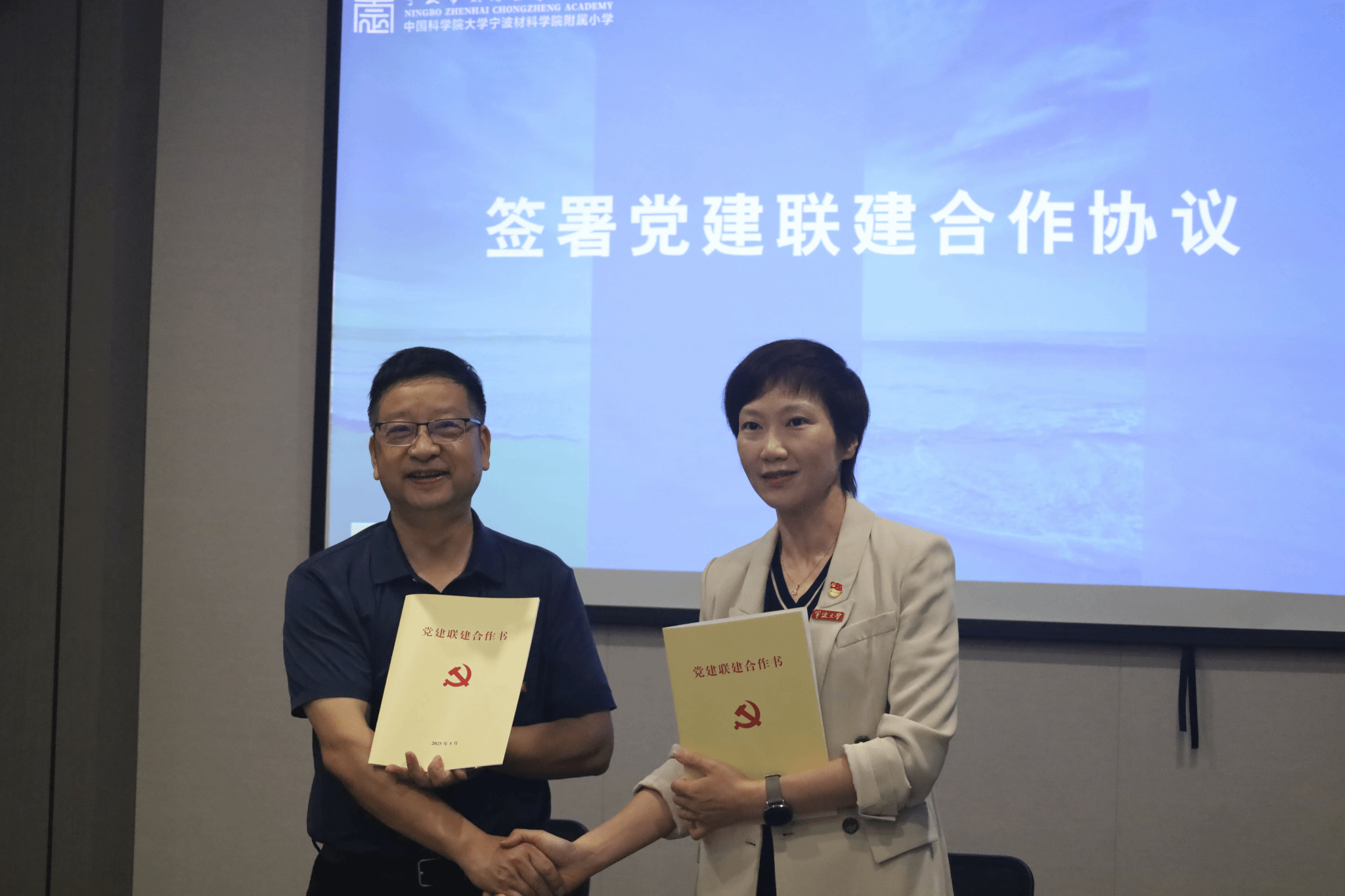 分别与崇正书院、精英小学、澥浦中心学校签订党建联建合作书,并赠送海洋科普书籍,正式启动“组织共建、资源共享、人才共育”合作机制。刘训华与邵丽共同为三所学校授予“海洋教育实验学校”。