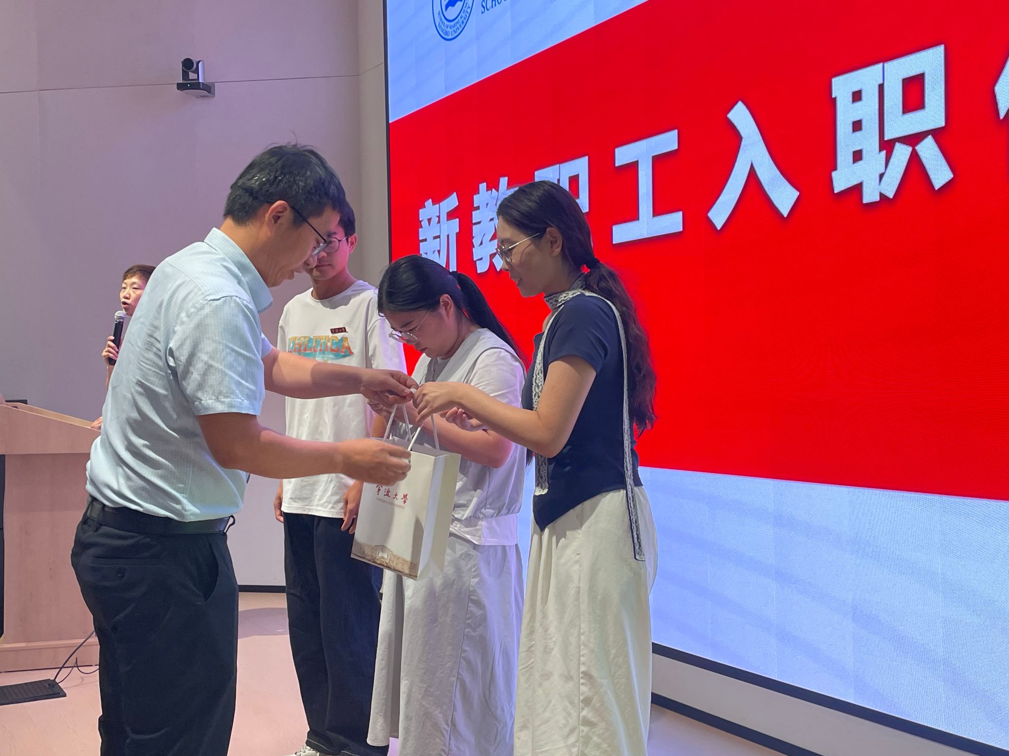 校徽并赠送纪念品,热烈欢迎他们正式成为学院大家庭的一员。包玉刚卓越人才、新教师代表吴富村教授在发言中表达了加入蘑菇视频