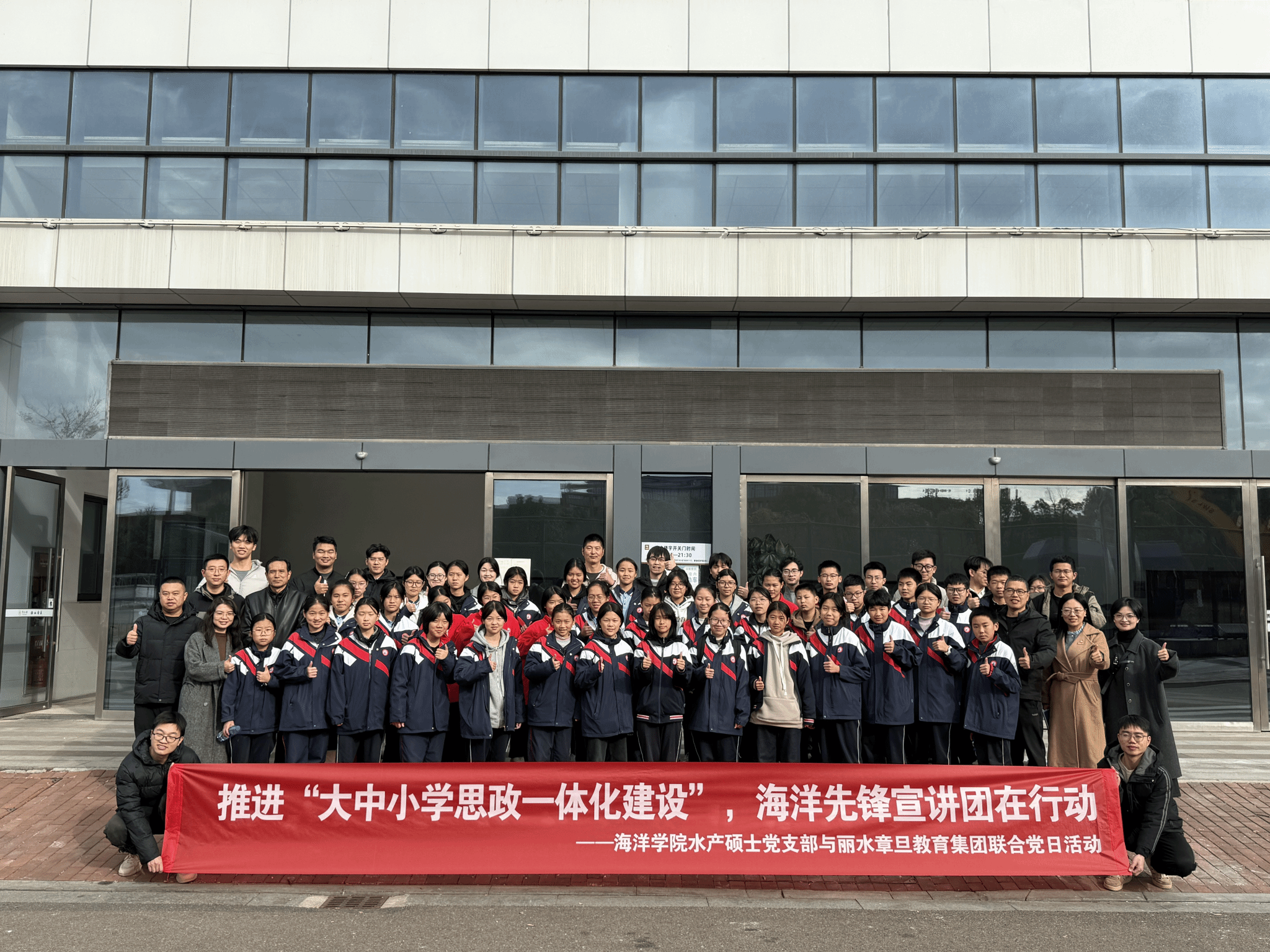 水产硕士第一党支部联合宁大附属春晓实验学校党总支、丽水章旦教育集团党总支,开展“推进‘大中小学思政一体化建设’,海洋先锋宣讲团在行动”主题党日活动,通过思政理论宣讲与海洋科普实践,共绘海洋强国蓝图。