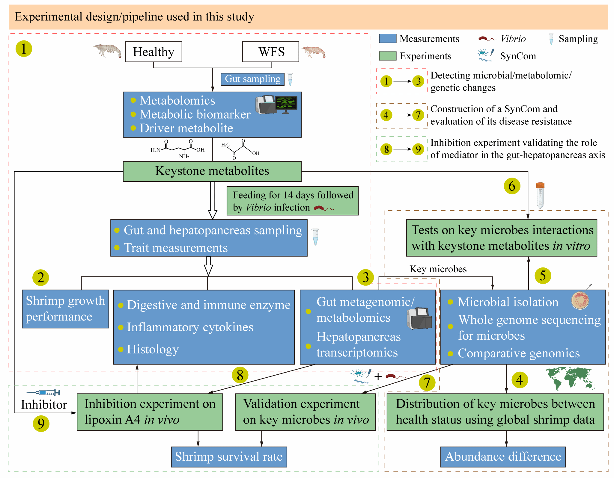 熊金波、陈炯研究员团队在微生物学领域权威期刊《Microbiome》(IF5 = 16.6,中科院双一区Top期刊)发表题为“Precisely designed keystone metabolites boost shrimp disease resistance by recruiting symbionts via the lipoxin A4–AP-1 pathway”的研究论文。该研究运用微生物生态学原理精准鉴定对虾肠道中的关键代谢物,基于“核心菌群—LXA4—AP-1”轴解析了关键代谢物定向招募有益菌以增强宿主抗病能力的益生机理,并经全球尺度数据验证(图1)。