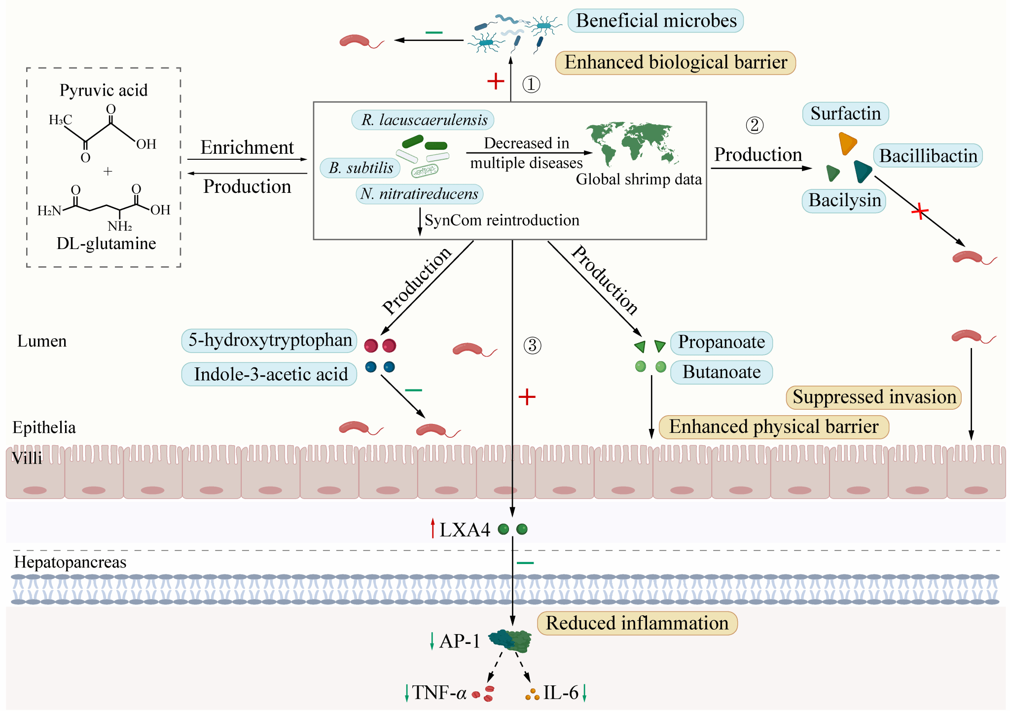 精准鉴定维持宿主健康的关键代谢物并构建高效增强宿主抗病力的合成菌群(SynCom),是生命科学研究的焦点和难点。本研究以凡纳滨对虾为模型,借鉴微生物生态学中“指示菌”与“驱动种”的筛选原则,精准鉴定丙酮酸与DL-谷氨酰胺为关键代谢物,证实其能显著增强对虾对WFS的抗性。关键代谢物通过定向招募三种益生菌(Ruegeria lacuscaerulensis, Bacillus subtilis和Nioella nitratireducens)提高了菌群互作网络的稳定性。基因组分析揭示这些菌株携带短链脂肪酸合成及抗菌肽编码基因,具备显著的宿主保护功能。全球数据集分析进一步验证这三株菌在患病对虾中普遍呈现丰度降低趋势。据此构建的SynCom成功复现了代谢物的保护效能。同时,关键代谢物与SynCom均通过提高肠道和肝胰腺中LXA4水平,进而抑制促炎转录因子AP-1的表达,最终实现免疫保护,通过抑制剂、核心代谢物补偿体内、体外实验验证。该研究成果基于微生物生态学理论精准设计益生元和合成菌,对症防控病害提供了理论框架,并从“核心菌群—LXA4—AP-1”轴角度,解析了关键代谢物协同益生菌增强宿主抗病性的益生机理(图2)。