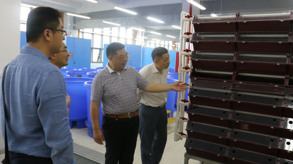最后,王院长与蔡书记陪同杨院长一行参观了梅山校区中试基地,同时对中试基地中的海水养殖设备等做了介绍与演示。