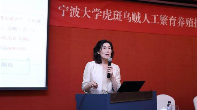蒋霞敏教授向大家介绍了人工繁育养殖虎斑乌贼的新技术和新成果。研究团队先后开展了虎斑乌贼的繁殖生物学、规模化人工育苗、高效养殖模式、养成配合饲料、病害防治等方面的研究,率先在国内突破了规模化人工繁育和健康养殖技术,繁育出2 厘米以上的苗种120余万只,养成500克以上商品乌贼11万只,创造了国内人工养殖数量最多、单体最大的历史记录,标志着宁波市人工养殖虎斑乌贼取得新突破,为开展大规模养殖奠定了基础。目前,这一市级重大科技专项已通过专家验收,相关技术已经在浙江、福建等地开展应用推广,效果显著。据悉,最快今年7至8月,市民可在市场上买到大批鲜活的虎斑乌贼,一饱海鲜口福。