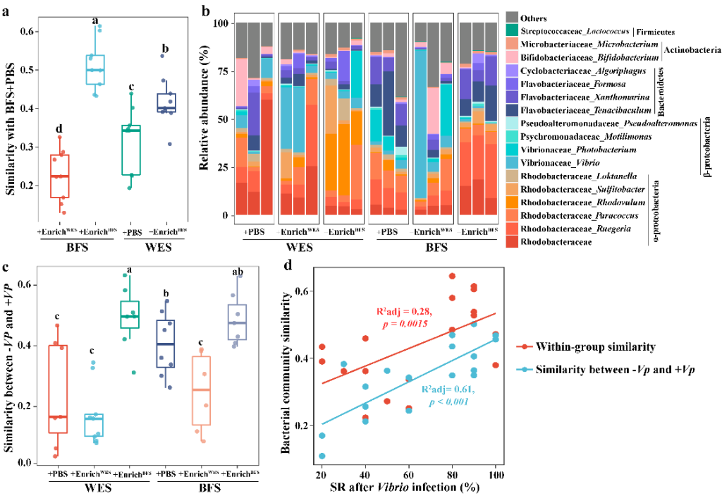 张德民教授和郭海朋副教授团队发现,生物絮团技术养殖的凡纳滨对虾具有高的抗弧菌侵染性能,微生物组学研究发现絮团虾肠道显著富集了某些特异性的细菌类群,进一步通过粪菌移植和人工合成菌群构建证实了这些特异性的细菌类群可以显著提升肠道菌群的稳定性和消化免疫能力,进而增强了对弧菌侵染的抗性。研究成果以“Gut bacterial consortium enriched in a biofloc system protects shrimp against Vibrio parahaemolyticus infection”为题发表在《Microbiome》(IF=15.5)。该研究得到了宁波市重大专项等项目的资助。