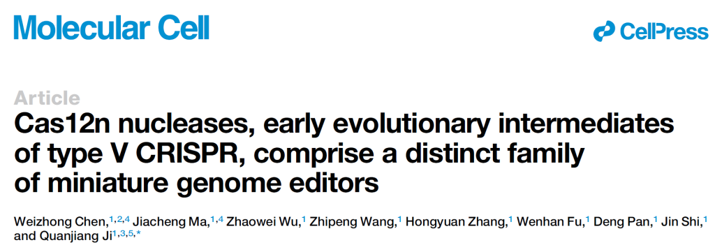 CRISPR-Cas12n是一类V-U4型CRISPR系统,与V型CRISPR系统的祖先——转座相关核酸酶TnpB具有最近的亲缘关系,可能是TnpB演化为其它V型Cas核酸酶的最早进化中间体。目前尚没有对该类CRISPR系统的性质和功能的研究报道。研究人员对CRISPR-Cas12n进行了系统表征并发现它是一类微型基因编辑系统,具有与TnpB较为相似生化特性,进一步证明了两者之间的亲缘性。
