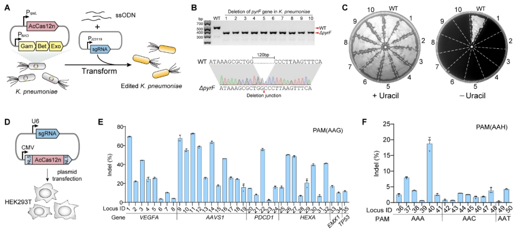 图1. AcCas12n系统在细菌和人体细胞中的基因编辑