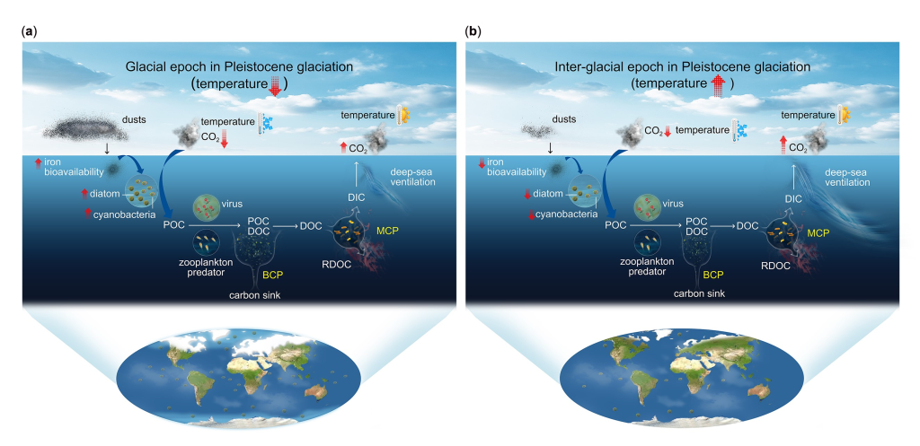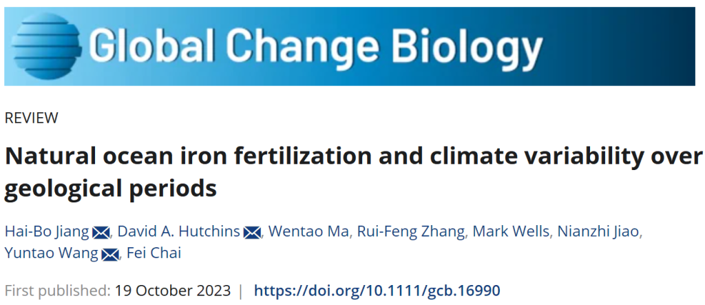 姜海波教授与美国南加州大学、自然资源部第二海洋研究所等科研机构合作,通过梳理地质时期天然铁施肥与气候变化、浮游植物介导的生物碳泵或微型生物碳泵之间的关系,揭示了特定地质时期海洋中铁的生物可利用性在调节海洋初级生产力和气候变化中的作用。研究成果以“Natural ocean iron fertilization and climate variability over geological periods”发表在环境科学与生态学领域国际著名期刊Global Change Biology(中科院双一区,5-year Impact factor: 12.3)上。