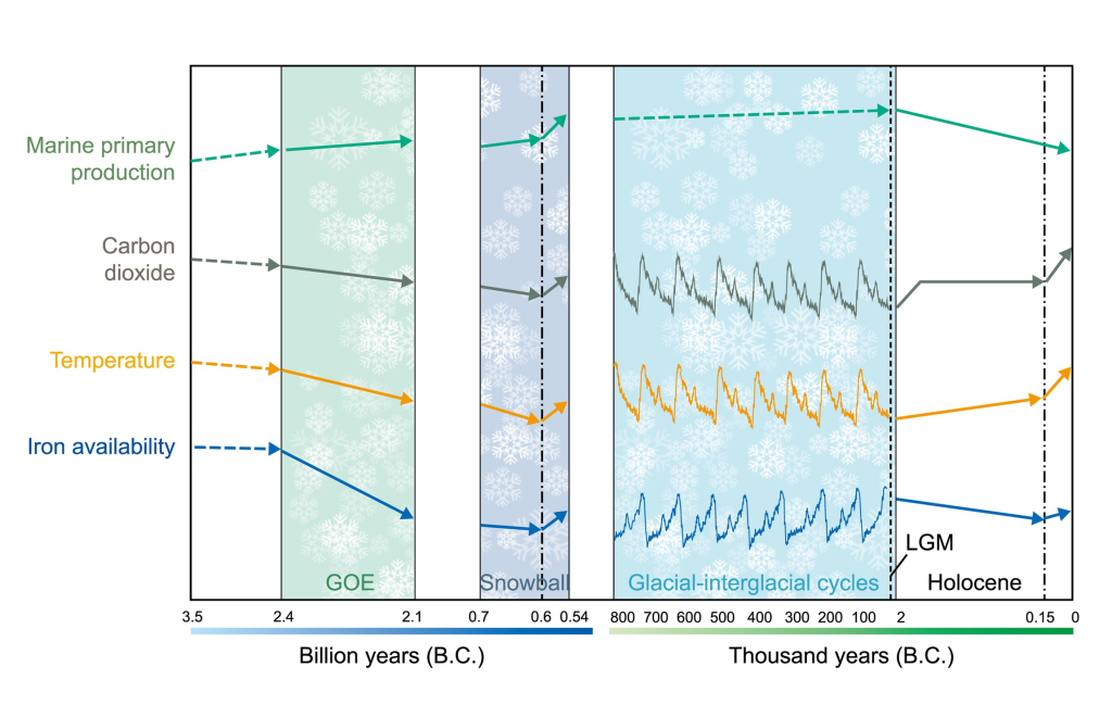 图1 不同地质时期铁有效性、温度、大气CO2含量和海洋初级生产力的趋势示意图。这些箭头表示相应参数的总体趋势,虚线箭头表示趋势高度不确定。(GOE:大氧化事件;Snowball:雪球地球事件;LGM:末次冰盛期。