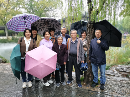 出发前往苏州拙政园,抵达苏州,恰逢秋雨刚落。天气虽显阴冷,但褪不去老教授们对苏州园林风景的热爱。一把小伞,相互搀挽,在烟雨中,细细品味园林之美。