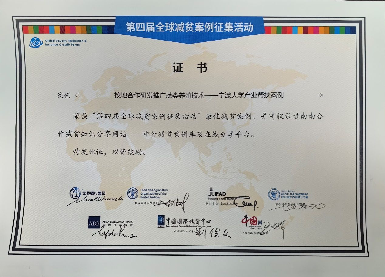 2023年11月1日在北京举行了全球减贫伙伴研讨会,会上发布了第四届“全球减贫案例征集活动”获奖名单。在全球32个国家征集的900多个原创优秀减贫和乡村发展案例中,宁波大学海洋学院报送的《校地合作研发推广藻类养殖技术——宁波大学产业帮扶案例》获评最佳减贫案例。该扶贫案例被收录至南南合作减贫知识分享网站(//south.iprcc.org.cn/),向世界各地的使用者分享中国和国际成功的减贫模式及创新实践。