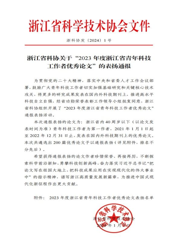 近日,浙江省科协宣布了“2023年度浙江省青年科技工作者优秀论文”的遴选结果,并对获奖者发出表扬通报。此次评选共有200篇论文(含CNS正刊44篇)脱颖而出,其中蘑菇视频
