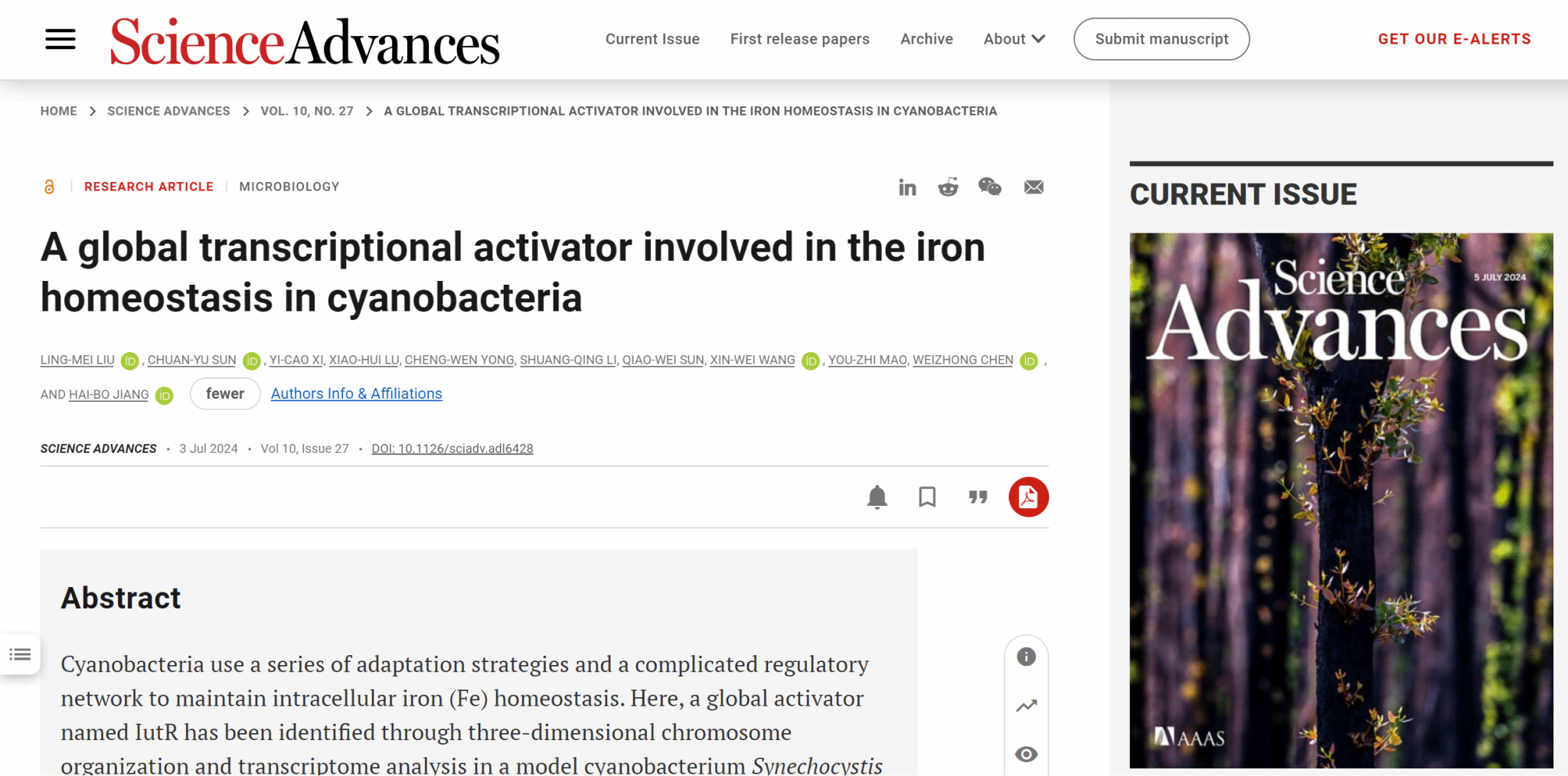 7月3日,宁波大学海洋学院姜海波教授团队在Science子刊《Science Advances》上发表了题为“A global transcriptional activator involved in the iron homeostasis in cyanobacteria”的研究论文(图1),揭示了一个全局性转录激活因子参与调控蓝藻铁稳态的新机制。
