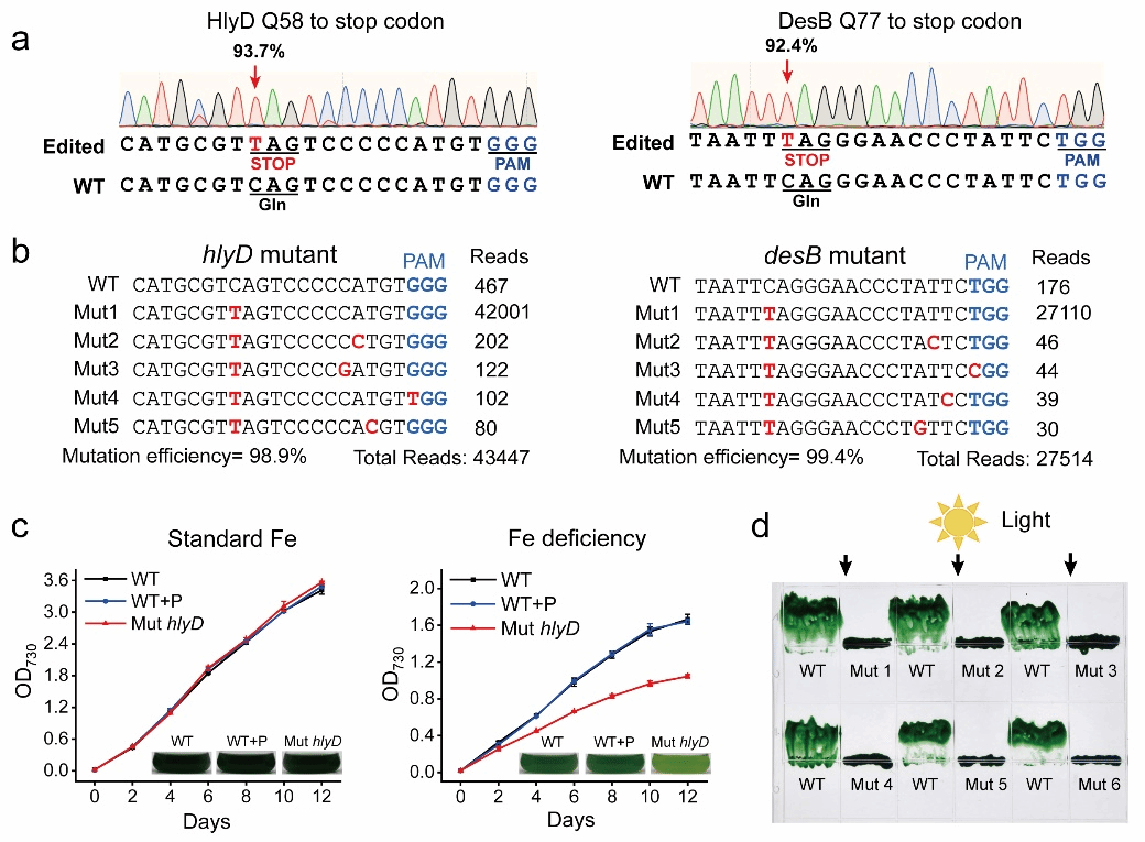 图2. 碱基编辑器能在蓝藻基因组的特定位点实现精确碱基突变