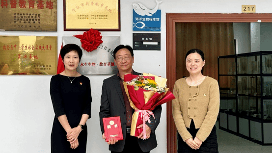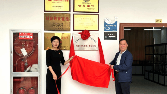 海洋学院党委书记、学院关工委主任邵丽和校关工委常务副主任冯志敏共同为科普(水生生物)教育基地揭牌。