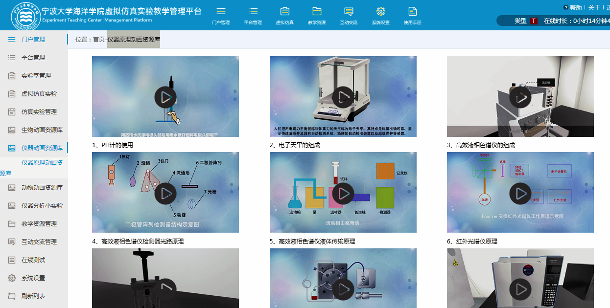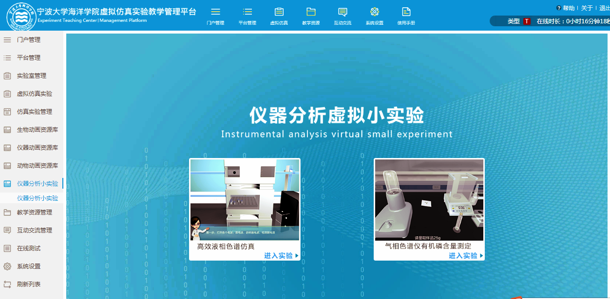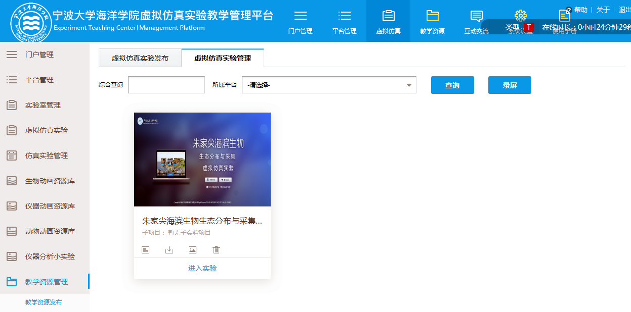 4、进入海洋学院虚拟仿真实验教学管理平台。虚拟仿真实验的发布和管理包括: 虚拟仿真实验报告、虚拟仿真实验过程的在线记录、虚拟仿真实验行为记录和统计;数字化教学资源管理模块包括:教学课件发布管理模块、精品课程发布管理模块、教学视频发布管理模块、数字化课程发布管理模块;在线测试模块包括:题库管理模块、考试规则管理模块、成绩管理模块等;