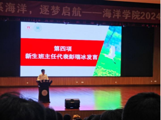 随后,新生班主任彭瑞冰老师发言,他以自己多年从事海洋研究的亲身经历,鼓励新生们要勇于探索未知,敢于面对挑战,树立目标,提升自我,包容差异,独立成长,珍惜大学时光,积极交流学习,不断突破自我,成为未来海洋事业的栋梁之才。