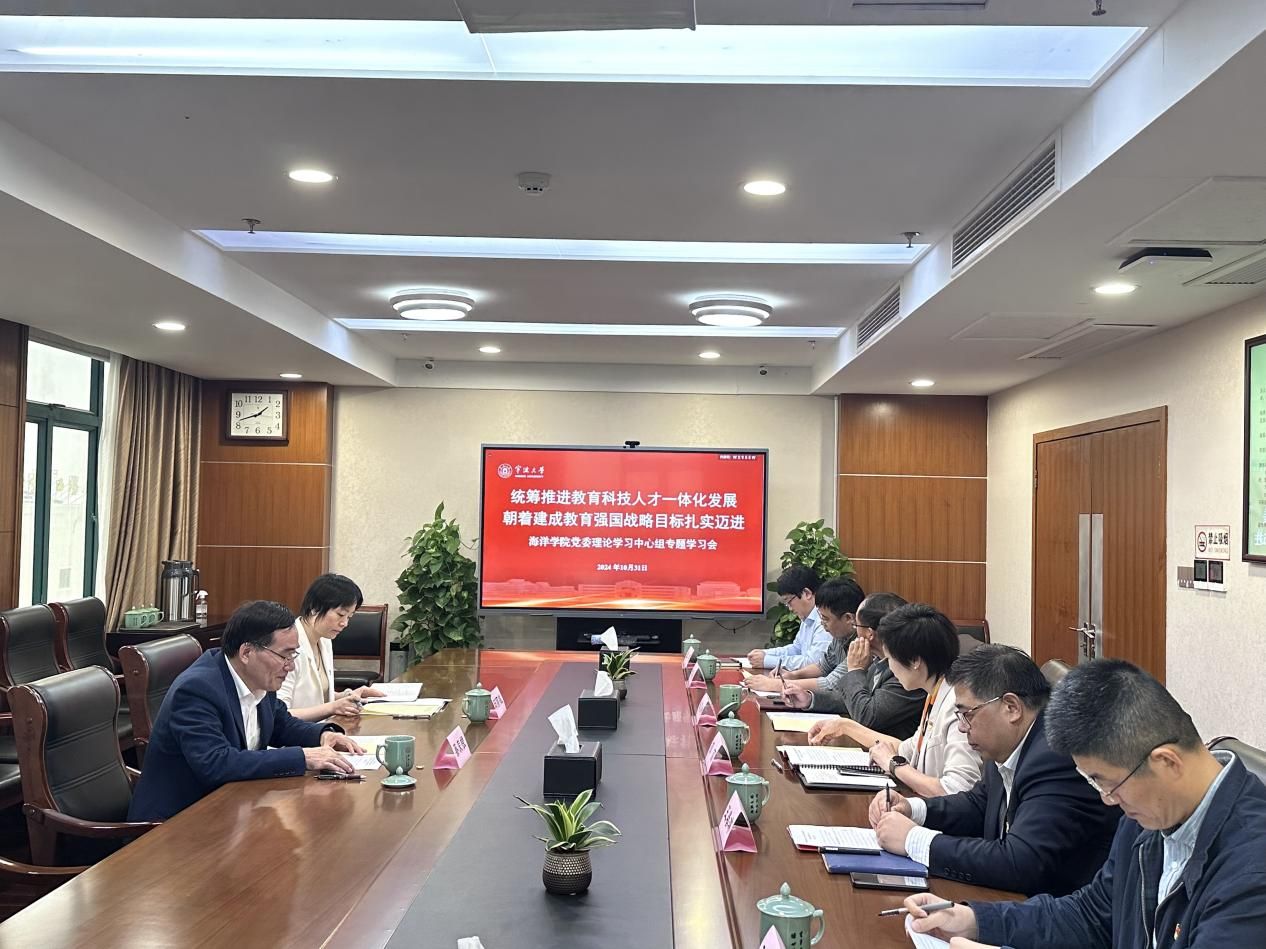 10 月 31 日下午,依照校党委的统一部署,海洋学院党委理论学习中心组组织召开“统筹推进教育科技人才一体化发展,朝着建成教育强国战略目标扎实迈进”专题学习会,校长蔡荣根和学校二级党组织理论学习中心组巡听旁听第二小组成员到会指导,学院党委理论学习中心组成员参加了本次会议,会议由学院党委书记邵丽主持。