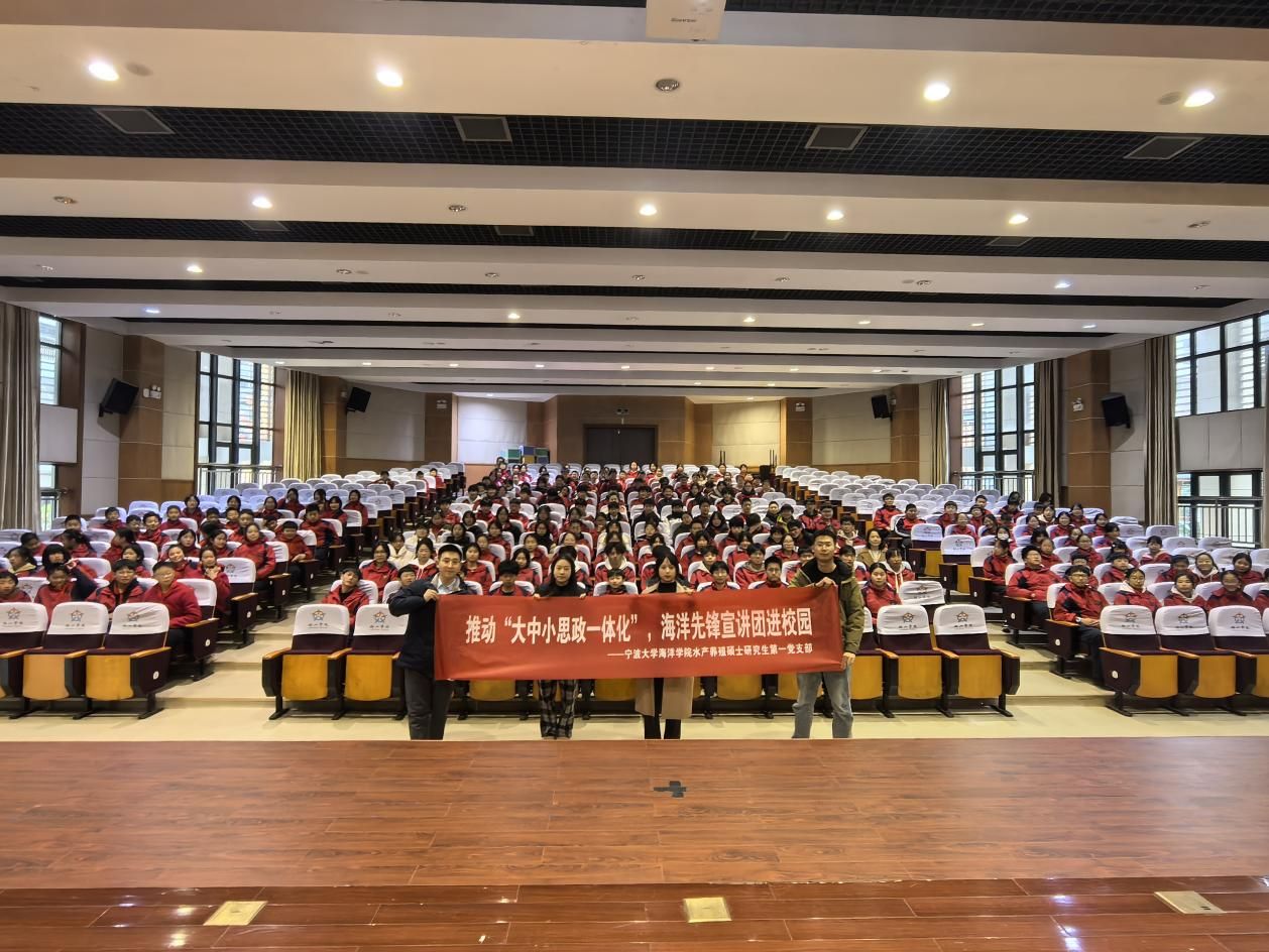 为推动大中小学思想政治一体化建设,全面贯彻党的教育方针,落实立德树人根本任务,坚持思政课堂与党的创新理论武装同步推进。12月18日下午,全国高校“百个研究生样板党支部”——宁波大学海洋学院水产养殖硕士研究生第一党支部走进北仑区梅山学校初中部,开展推动“大中小思政一体化”,海洋先锋宣讲团进校园职业规划宣讲活动。