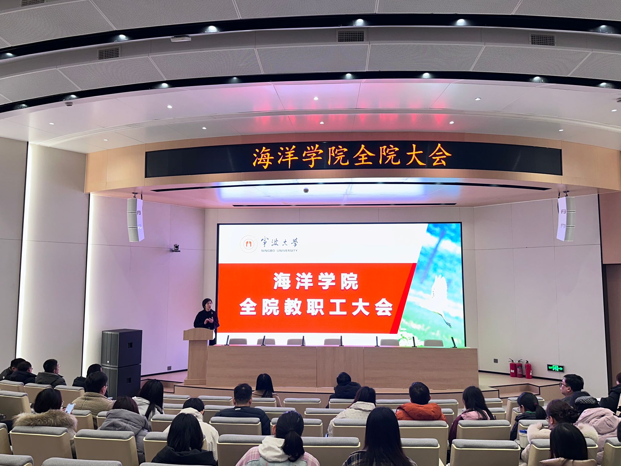 2月21日上午,海洋学院2025年新学期全院教职工大会在梅山校区中试基地一楼报告厅召开,学院党委书记邵丽主持会议,全体教职工出席。