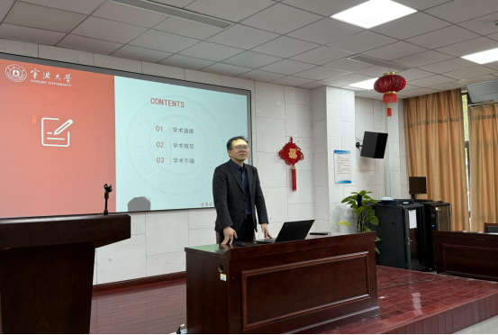 姜海波教授深入解读了学术道德的重要性、学术规范的具体要求以及学术不端的危害性,他结合国内外典型案例,系统剖析了学术造假、剽窃、数据篡改等行为的危害,详细讲解了学术引用的规范、成果署名原则以及实验数据的真实性要求。他特别指出,学术道德不仅是规则约束,更是学者自律精神的体现,“要让科研领域成为阳光下最纯洁,最神圣的一方净土”。他呼吁学生们要大力弘扬科学精神,恪守学术道德,以严谨的科研态度和强烈的社会责任感着力推进学术道德建设。