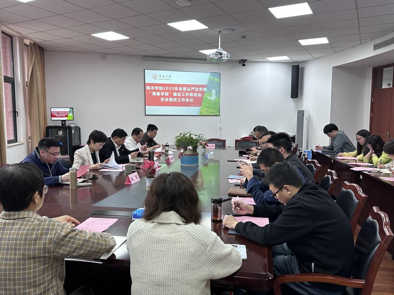 4月24日上午,海洋学院召开2025年全面从严治党暨清廉学院建设推进会、2025年安全稳定工作会议。会议深入学习了宁波大学2025年全面从严治党工作暨清廉宁大建设推进会、2025年安全稳定工作会议精神。学院党政领导、教工党支部书记、纪委委员、学术团队负责人、各内设机构负责人等参加会议,特聘院长、党委委员王春琳主持会议
