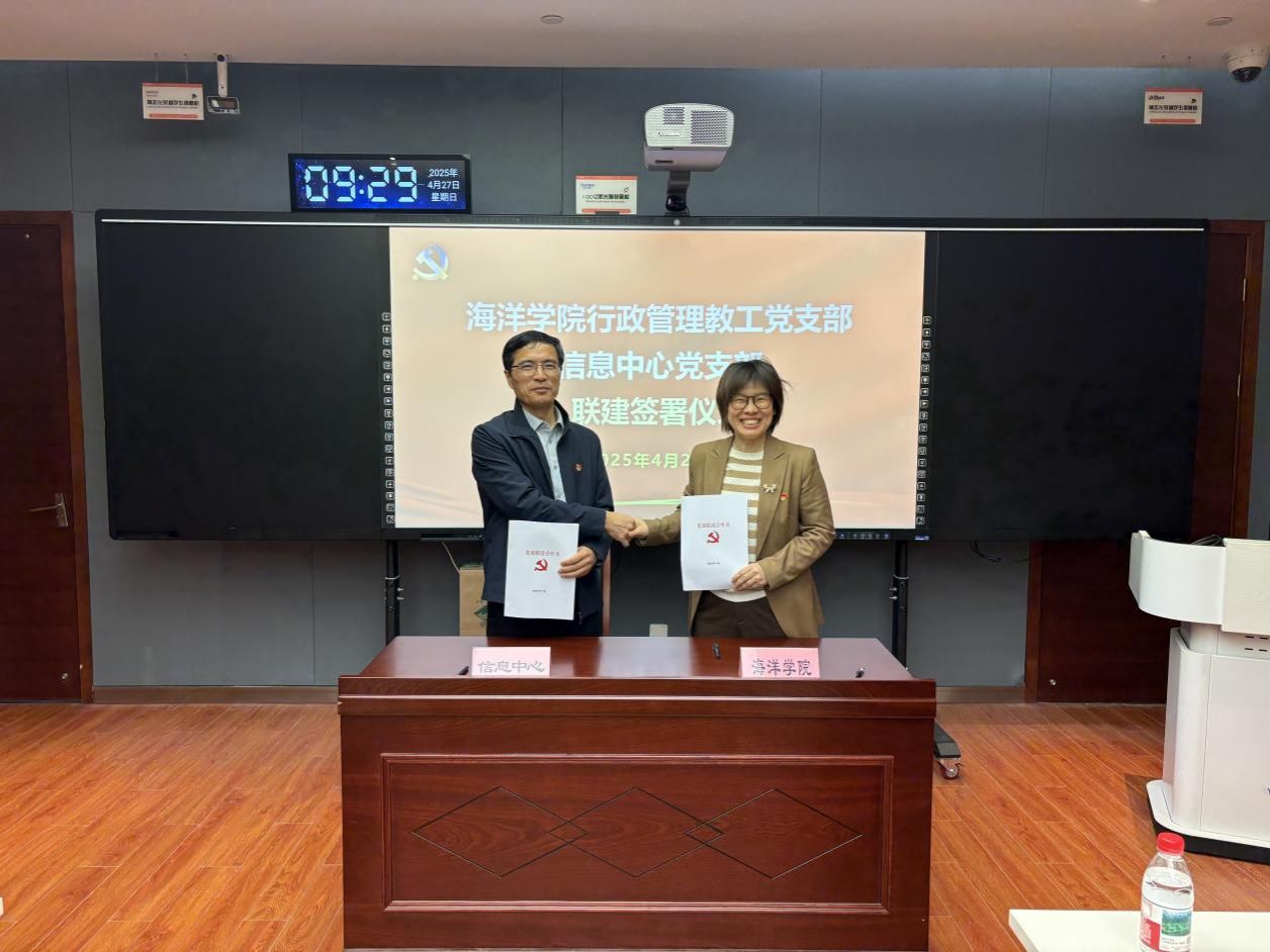 在联建仪式环节,信息中心党支部书记董其军对海洋学院行政管理教工党支部的到来表示热烈欢迎。他表示此次联建是深化协同、精准对接需求的重要契机,信息中心将主动倾听学院在人才培养、科研创新、管理服务中的信息化需求,通过优化技术手段、完善数据治理与应用,为海洋学院特别是登峰学科提供更高效、更精准的信息化服务支持,共同破解发展难题。信息中心党支部书记董其军、海洋学院行政管理教工党支部书记包红燕分别介绍各自支部建设情况、党员队伍及近年取得的荣誉成果,并代表双方签署联建协议。