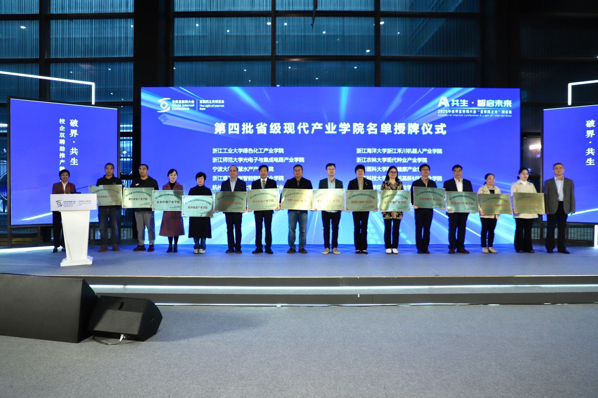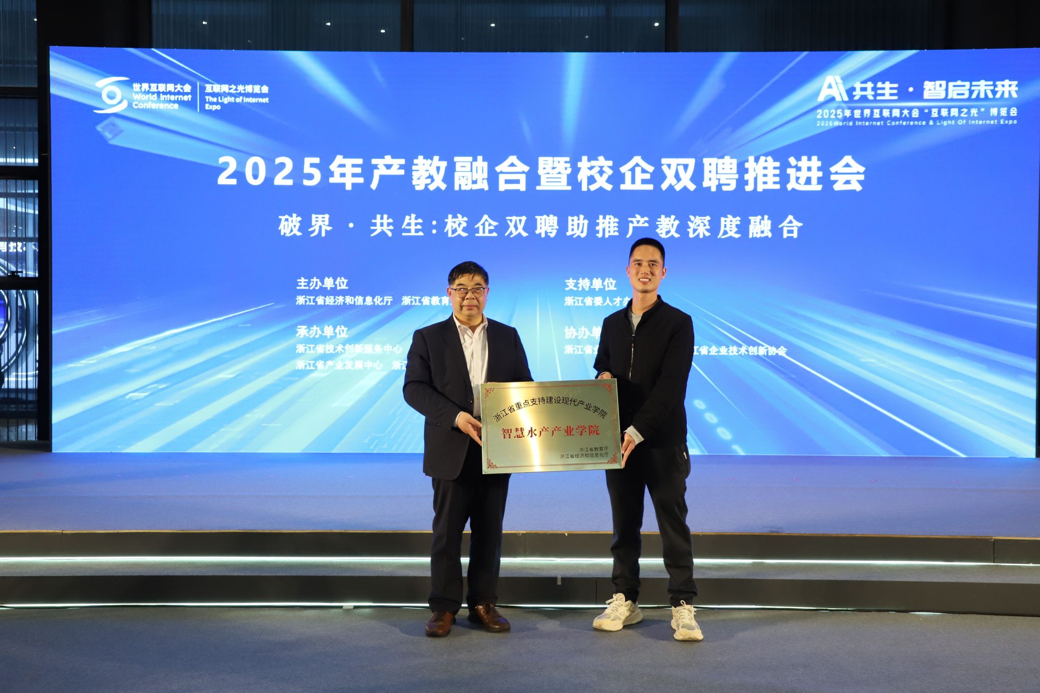 会上,王春琳作为 “智慧水产产业学院”的负责人和代表,上台接受了浙江省重点支持现代产业学院授牌。海洋学院始终深耕海洋与渔业领域产教融合,此次参会进一步拓宽了校企合作渠道,为后续深化水产学科与产业的精准对接、培养高素质渔业创新人才奠定了坚实基础。