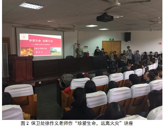 活动于14点50分在包玉书科学楼12号楼开始。首先在1楼报告厅由潘道东副院长对2017级研一新生进行了安全意识动员教育,强调了实验室安全的重要性,提醒学生们安全无小事,要防患于未然。然后,邀请了保卫处徐作义老师作了题为“珍爱生命,远离火灾”的讲座报告,详细讲解了火灾引发的原因、类型、灭火的种类和特点,示范了灭火器的使用方法,同学们从中了解学习到如何在实际生活中面对火灾逃生自救互救。接下来,在杨锐老师的指挥带领下,组织学生按照逃生路线进行了从12号楼里逃生疏散的演练,分为拉响警报、报警、疏散等演练步骤。最后,在12号楼附近的空地上师生们进行了灭火器灭火练习。演练使大家得到锻炼,一旦发生事故,懂得应该做什么、能够做什么、如何去做等。