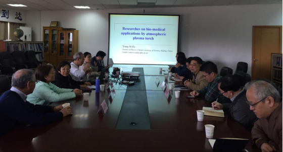 会中,杨思泽对大气压等离子体在生物医药方面的研究应用做了汇报,分别介绍了大气压等离子体的制备设备、等离子在杀菌方面的应用、等离子体在癌症治疗方面的应用等。赵桂芬、施宪霖对海水淡化技术进行了介绍,详述了海水淡化的发展和现有技术水平,希望在海水淡化方向与我院合作,我院领导给予了积极回应,表达了合作意向。