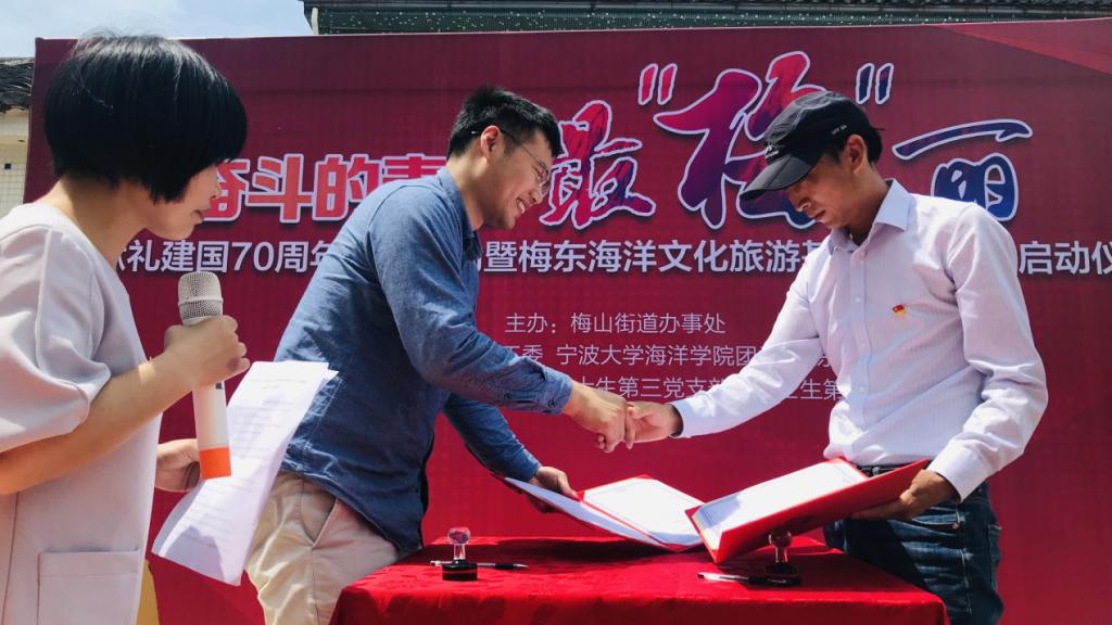 向建国70周年献礼,5月25日上午,宁波大学海洋学院团委、海洋学院硕士生第三党支部、硕士生第五党支部与梅山街道团工委、梅东村党委在梅东村合办开展“奋斗的青春最‘梅’丽”活动,梅东村党委与海洋学院硕士生第三党支部和第五党支部、梅山街道团委与海洋学院团委开展现场结对共建签约仪式,共建开展的“青年党员助力海洋乡村生态建设——植物科普宣传下乡”党日活动也正式启动。梅山街道党工委委员吴文华、学院团委书记、学生党支部书记、街道党团干部和居民、学生党员义工等50余人参加活动。