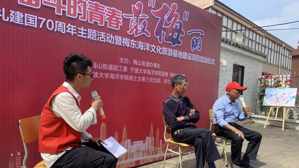 首先,学生义工主持采访五位梅东村党团干部,五位干部介绍了梅东村的发展历史,特别是新中国成立以来老一辈党员艰苦奋斗、无私奉献建设梅东村的感人事迹,梅东村也从20世纪40年代的落后贫穷蜕变为现在村风文明、富裕美丽的社会主义新农村;梅东村党团干部与海洋学院团委书记、学生党支部书记就校地党建、团结结对共建,将凤凰山游步道打造成为海洋文化旅游基地进行了现场交流。