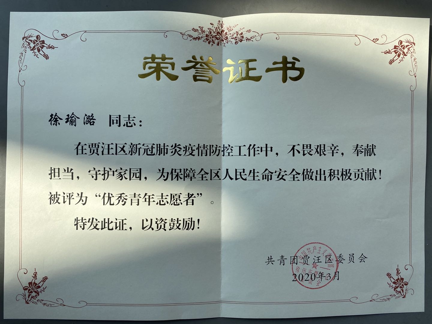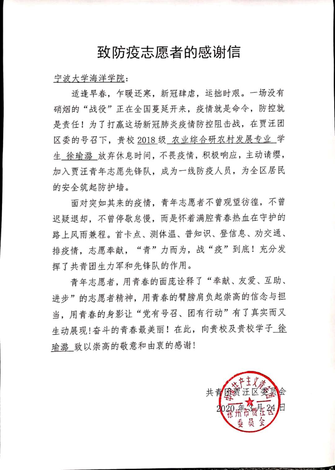 近日,海洋学院收到共青团徐州市贾汪区委员会寄来的《致防疫志愿者的感谢信》、《荣誉证书》以及表彰文件,感谢和表彰海洋学院2018级农村发展专业研究生徐瑜潞在防疫志愿者工作中发挥的先锋力量。