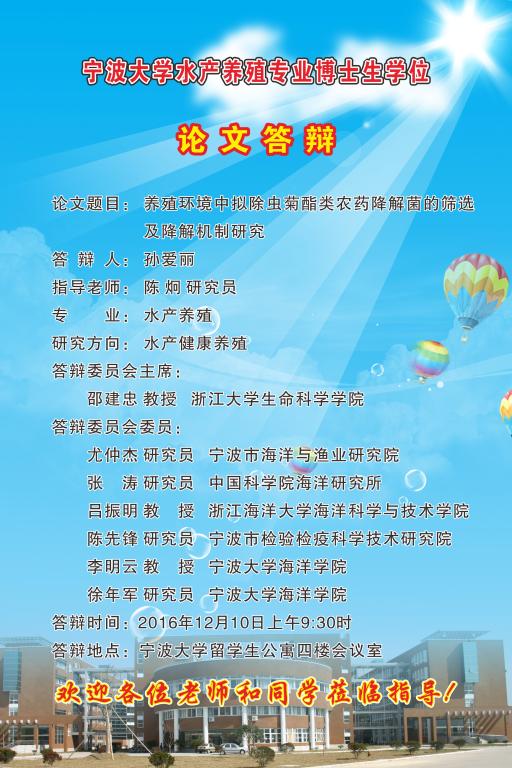 宁波大学水产养殖专业博士生学位论文答辩公告