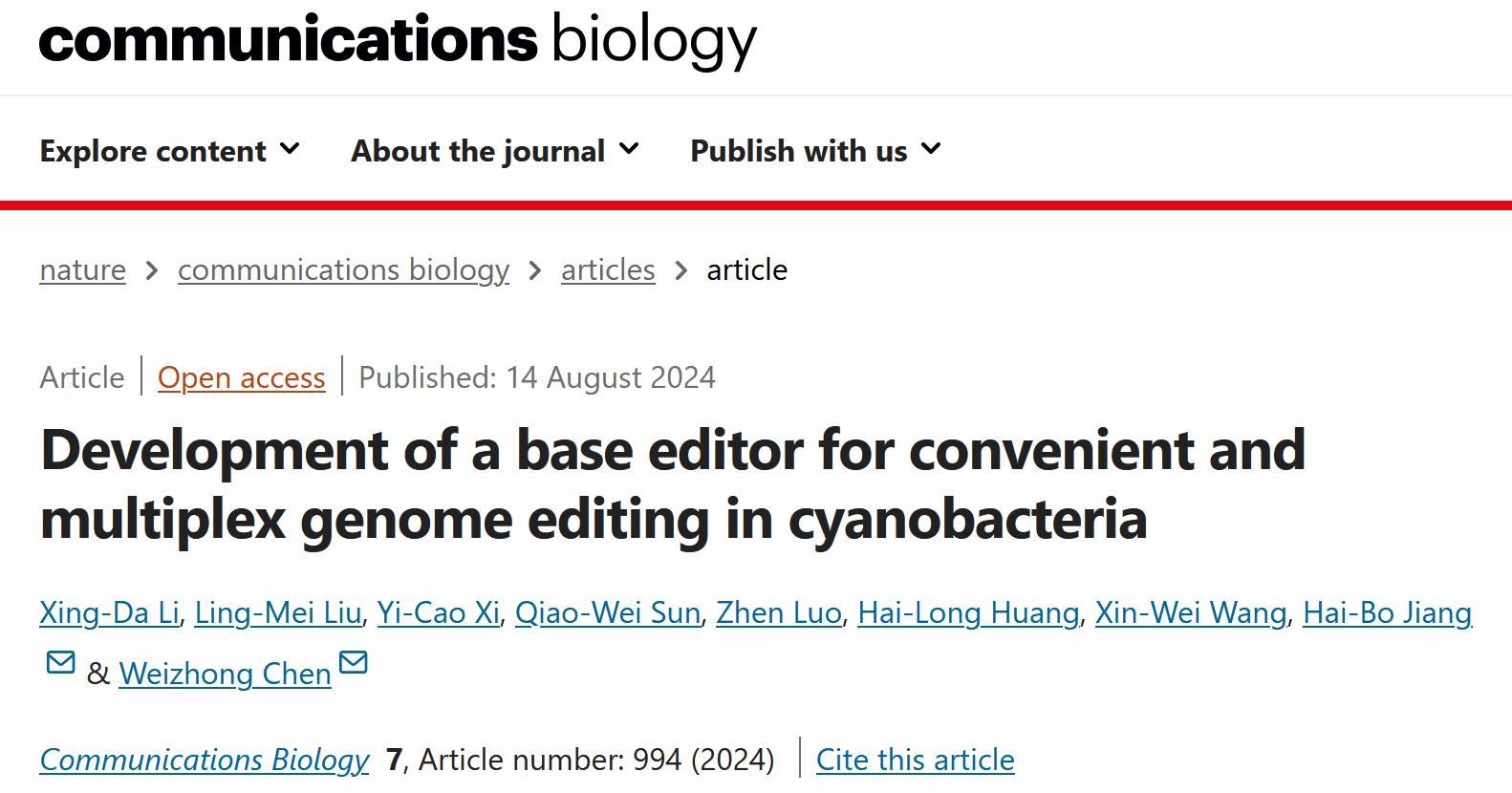 近日,宁波大学海洋学院姜海波教授团队在蓝藻中开发了一种新型的CRISPR基因编辑技术。该成果以“Development of a base editor for convenient and multiplex genome editing in cyanobacteria”为题,发表在Nature出版集团旗下的生物学知名期刊《Communications Biology》上(图1)。