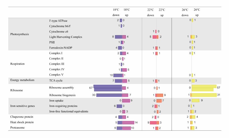 图2:铁限制/铁充足条件下,三角褐指藻不同代谢通路差异基因数量在亚最适温度、最适温度和超最适温度的变化情况